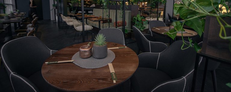 Rohelisuse, šokolaadi-, hallide ja samblakarva toonide ning suurte valgustite heleduse kombinatsioon on suurepärane valik nii ärilõunateks kui ka pereõhtusöökideks või kohtinguteks. Igaüks leiab oma lemmikkoha – kõrged, elegantsed baaritoolid, mugavad tugitoolid või hubased diivanid. Kangas või nahk – mõlemad on head ja mõlemat leiab restoranist „Kabuki“! Nagu ütlesime, on interjöör kohandatud igaühe maitsele!