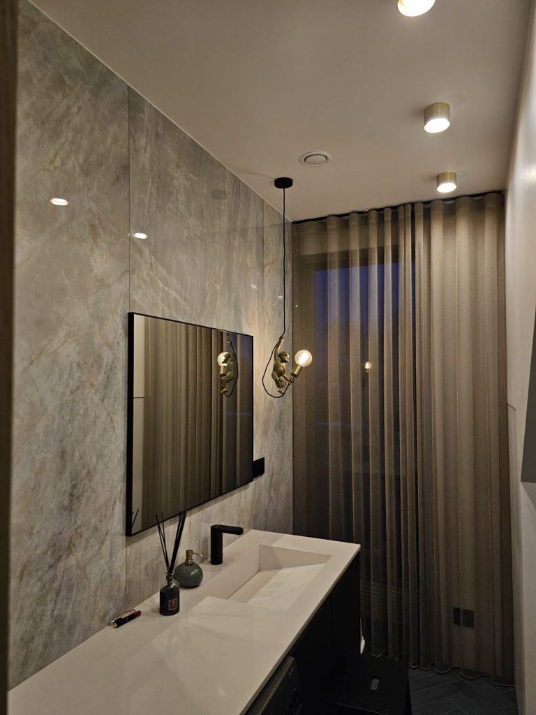 Interjera dizaineres Agneses Kalnītes izstrādātajā Ventspils privātmājas dizainā vērojami dažādu dekoratīvo apgaismojumu akcenti – lustras, griestu un sienu lampas. Tā kā mājas telpas ir plašas un ar augstiem griestiem, lampu izvēle ir ļoti būtiska un nosaka to, vai telpa izskatīsies piepildīta. Vietām griestos manāmi arī iebūvēti gaismekļi. LightUp parūpējies par daudzveidīgo apgaismojumu un gaismas slēdžu piegādi no ražotājiem Čehijā, Vācijā, Grieķijā, Polijā un Itālijā.