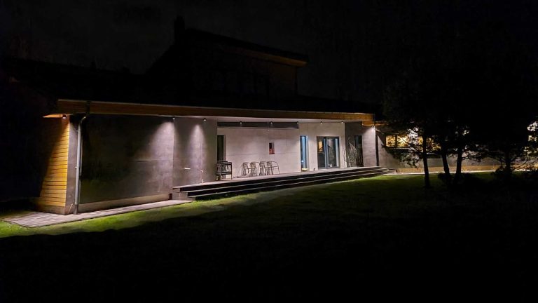“Rūsiņi” Olaines pagasta privātmājas fasādes apgaismojuma izvēli veikusi dizainere Zane Skalberga. Gaismekļi lieliski izceļ ēkas siluetu uz meža zaļā fona un rada tai grandiozu kopskatu. LightUp parūpējies par gan par moderno ārsienu, gan griestu gaismu piegādi.