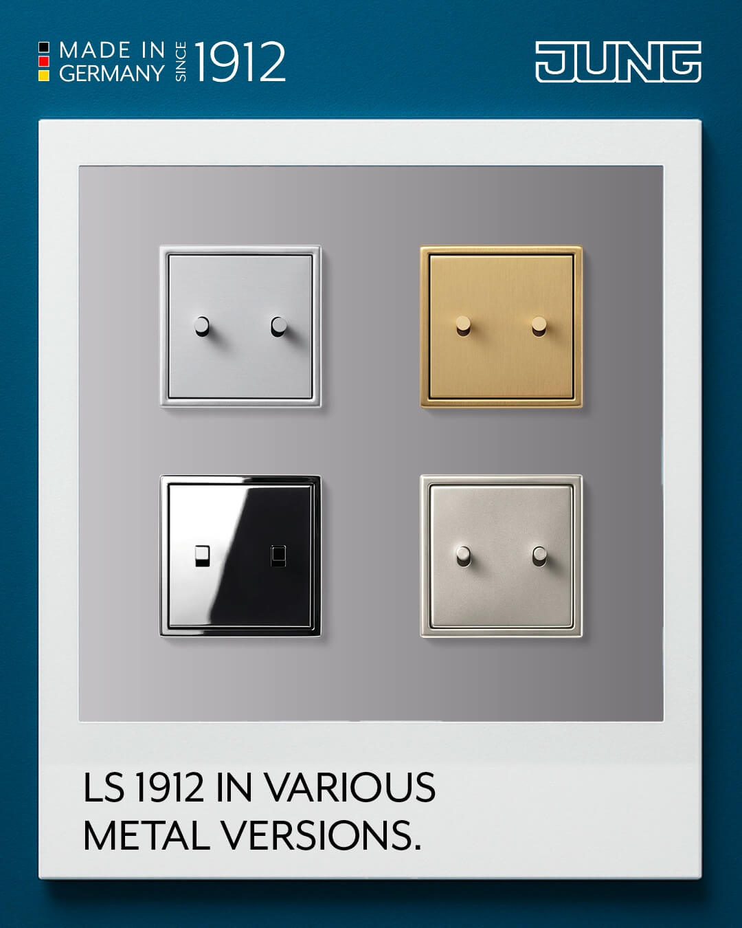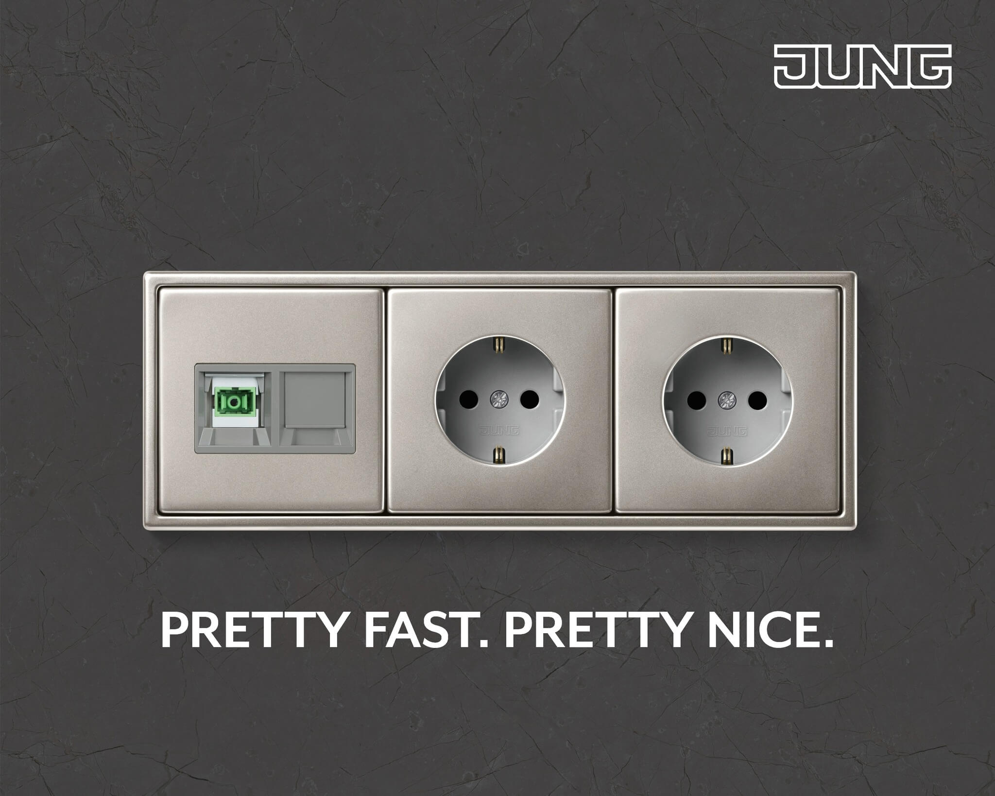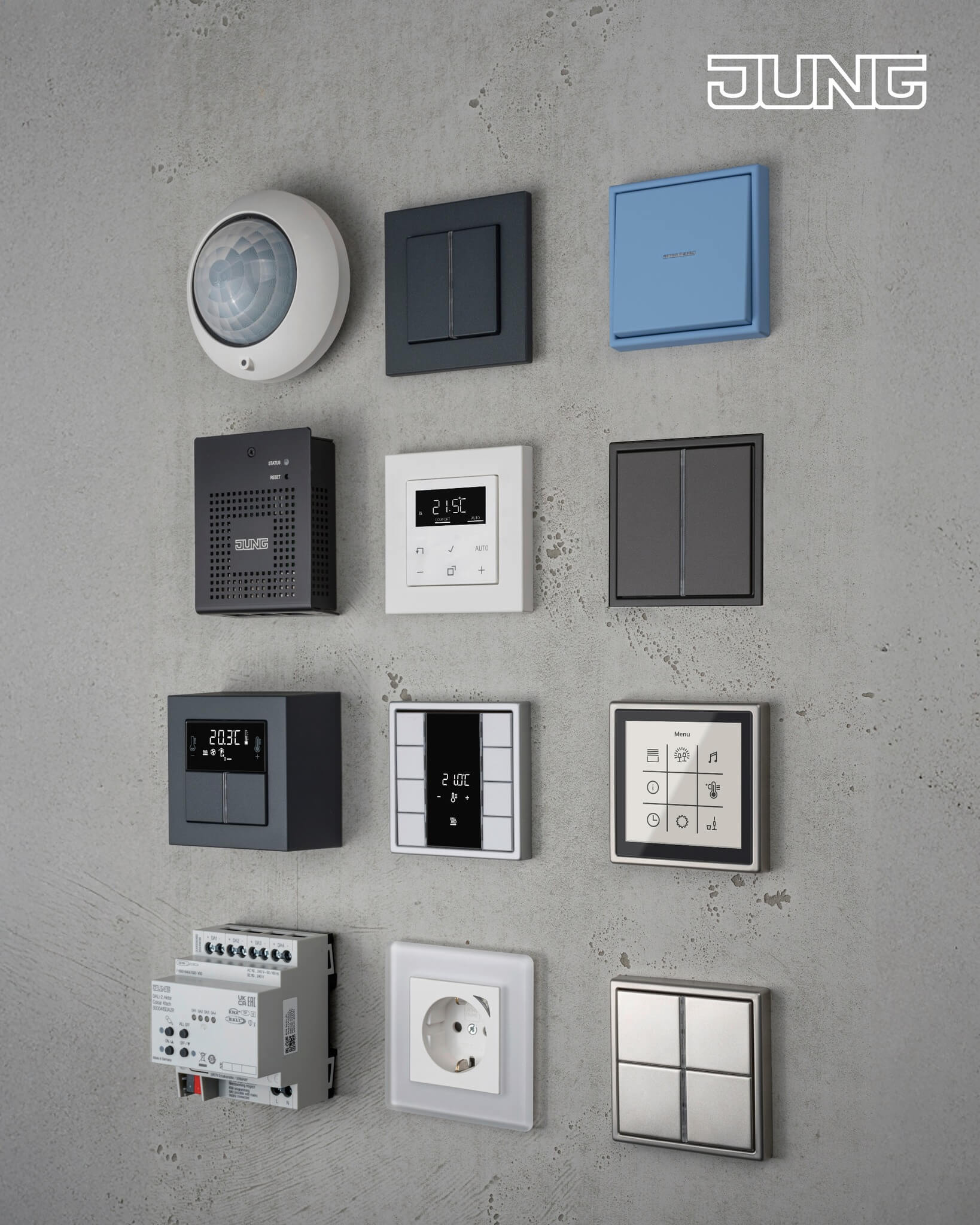 JUNG ir vācu premium klases elektroinstalācijas ražotājs ar vairāk nekā 100 gadu pieredzi, kas piedāvā plašu slēdžu, rozešu un vadības risinājumu klāstu moderniem interjeriem. Sortimentā ietilpst dažāda veida slēdži, tostarp modeļi ar integrētu LED apgaismojumu, kā arī iebūvējamu rāmi, kas ļauj eleganti apvienot vairākus elementus vienotā dizainā. JUNG piedāvā arī gudrās mājas sistēmas slēdžus apgaismojuma, klimata, žalūziju un citu funkciju vadībai. Produkti pieejami vairākās dizaina kolekcijās un krāsu, kā arī materiālu izvēlē – no plastmasa, stikla, metāla un citiem augstvērtīgiem materiāliem, ļaujot tos pielāgot dažādiem interjera risinājumiem.