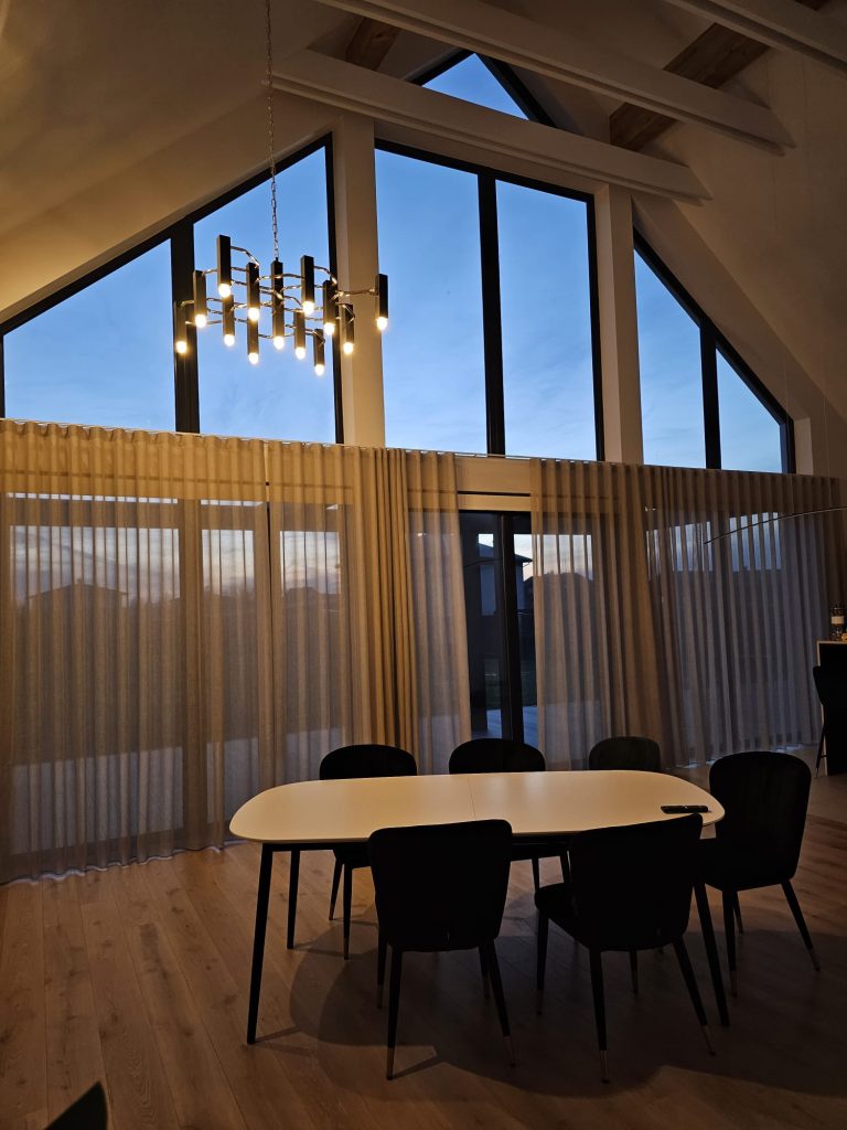 Interjera dizaineres Agneses Kalnītes izstrādātajā Ventspils privātmājas dizainā vērojami dažādu dekoratīvo apgaismojumu akcenti – lustras, griestu un sienu lampas. Tā kā mājas telpas ir plašas un ar augstiem griestiem, lampu izvēle ir ļoti būtiska un nosaka to, vai telpa izskatīsies piepildīta. Vietām griestos manāmi arī iebūvēti gaismekļi. LightUp parūpējies par daudzveidīgo apgaismojumu un gaismas slēdžu piegādi no ražotājiem Čehijā, Vācijā, Grieķijā, Polijā un Itālijā.