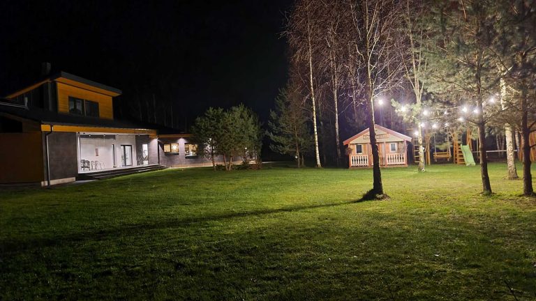 “Rūsiņi” Olaines pagasta privātmājas fasādes apgaismojuma izvēli veikusi dizainere Zane Skalberga. Gaismekļi lieliski izceļ ēkas siluetu uz meža zaļā fona un rada tai grandiozu kopskatu. LightUp parūpējies par gan par moderno ārsienu, gan griestu gaismu piegādi.