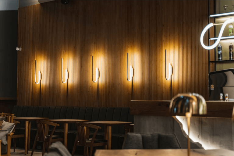 Uzņēmuma LightUp sagādātie apgaismojuma elementi piešķir telpām siltumu un eleganci. Sienas lampas rada mājīgu atmosfēru, bezvadu galda lampas nodrošina romantisku apgaismojumu, bet iekarināmās LED lampas virs letes apvieno funkcionalitāti ar mūsdienīgu dizainu. Dizaina krēsli ar mīksto apdari papildina kopējo telpas harmoniju. Apvienojot dabiskus materiālus ar siltiem metāla toņiem, interjers izstaro modernu eleganci un komfortu.